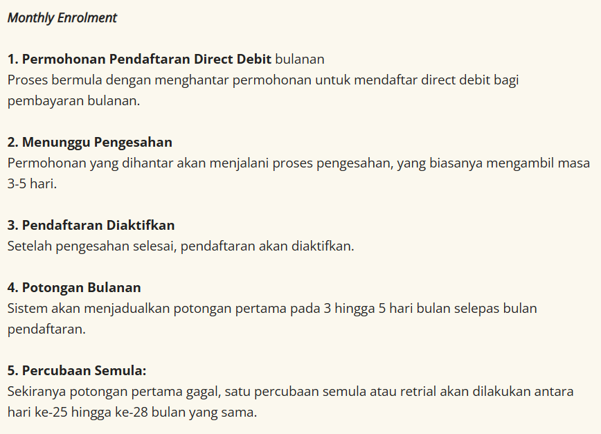 Nota : Potongan secara bulanan (3 bulan) akan di potong daripada akaun pembayar